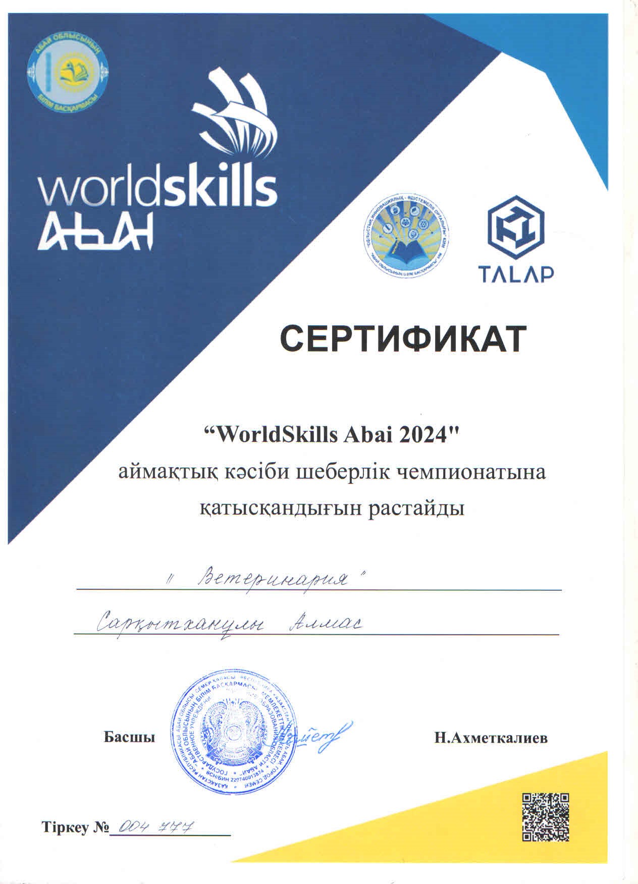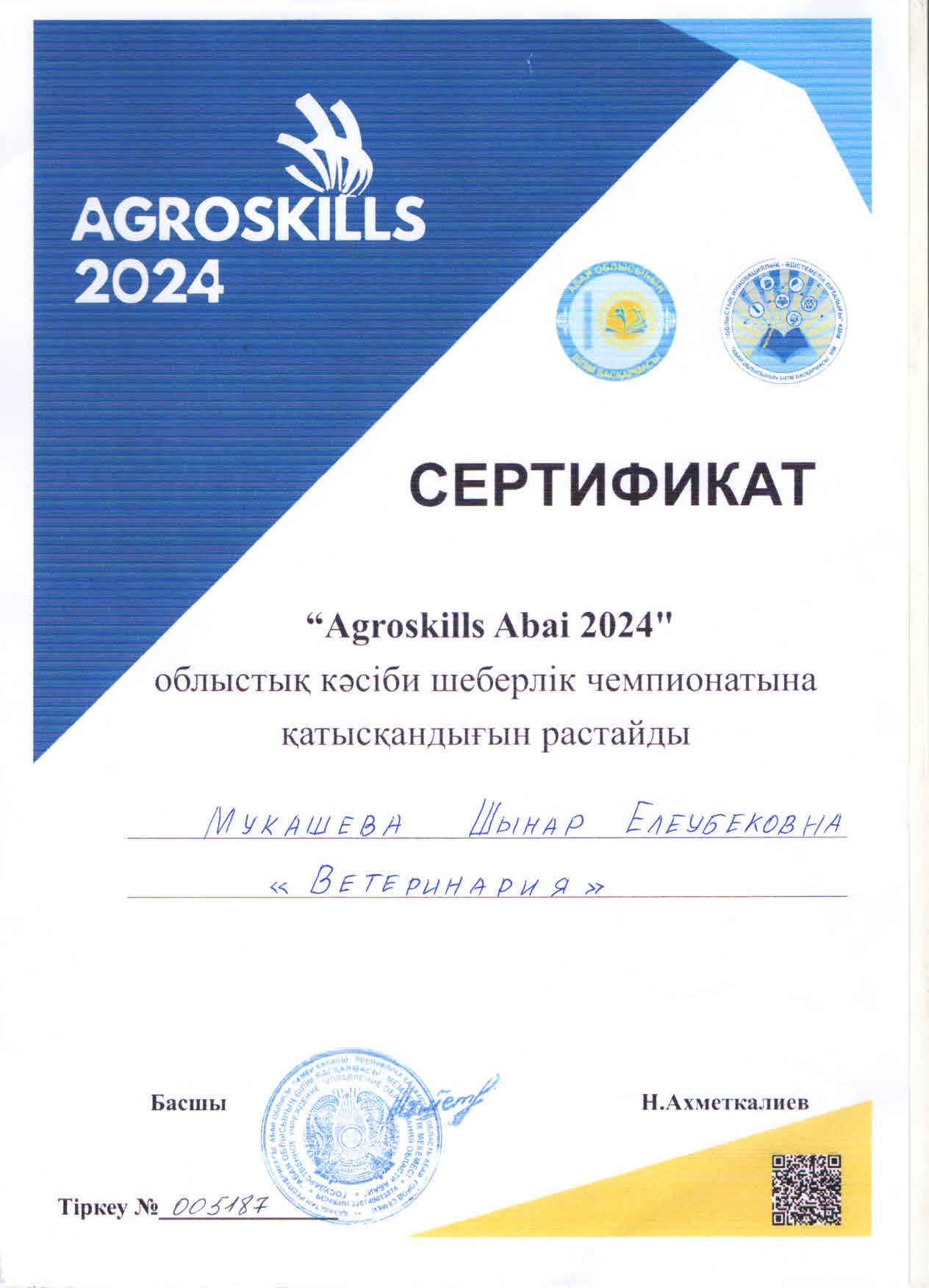 Ветеринария құзіреттілігі бойынша Ветеринария тобынының студенті Мукашева Шынар Елеубековна катысты. Жетекшісі: Саркытханұлы Алмас.