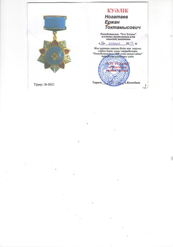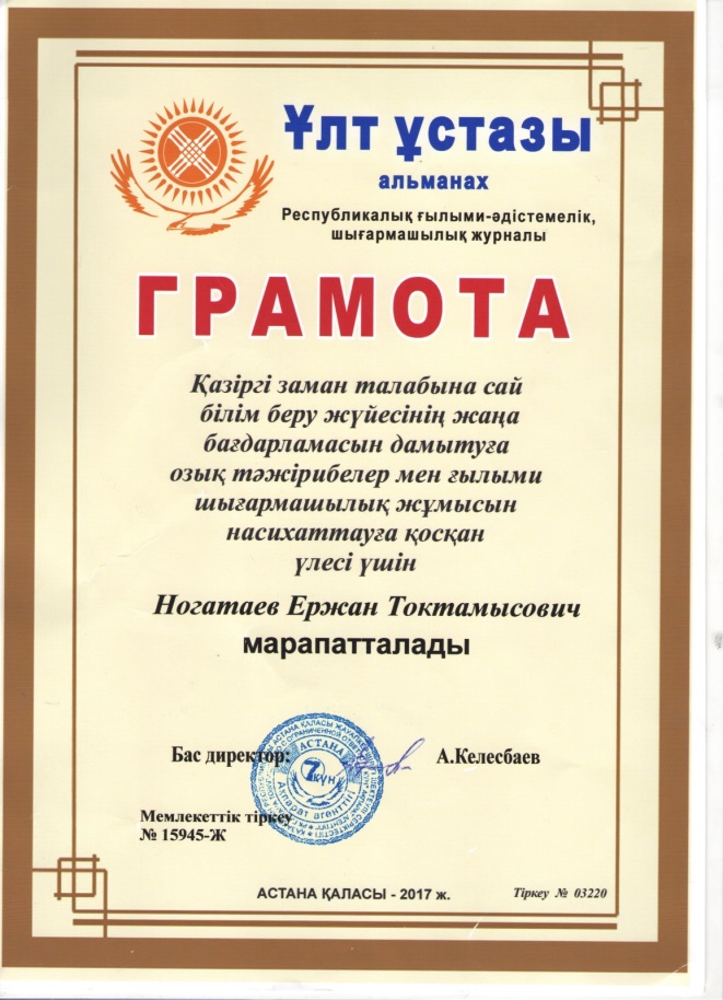 2017 оқу жылында қазіргі заман талабына сай білім беру жүйесінің жаңа бағдарламасын дамытуға өзімнің өзық тәжірибемдегі шығармашылық жұмысымды «Ұлт ұстазы » альманах республикалық ғылыми-әдістемелік, шығармашылық журналына жіберіп. Республикалық «1000 үздік ашық сабақ» атты жинақ кітабына еніп «Ұлт ұстазы» төсбелгісімен марапатталдым