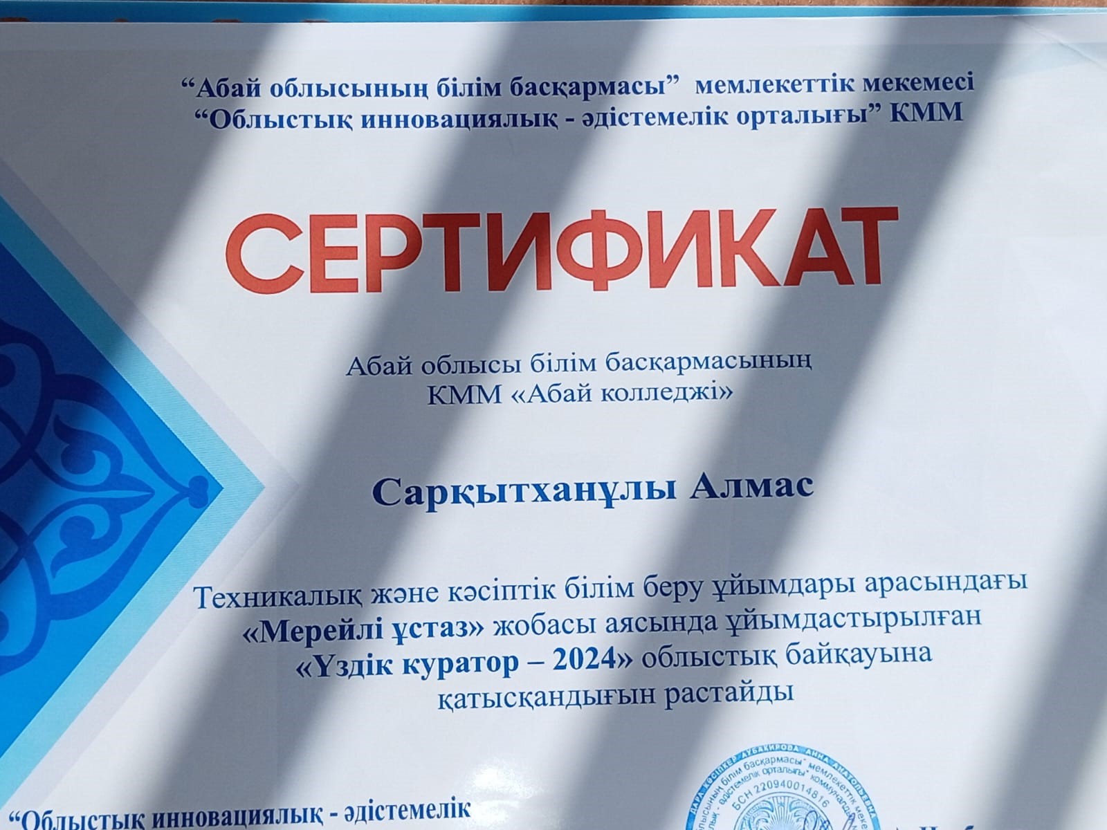Техникалық және кәсіптік білім беру ұйымдары арасындағы «Мерейлі ұстаз» жобасы аясында ұйымдастырылған «Үздік куратор-2024» облыстық байқауына қатысып, жүлдегер атанды.