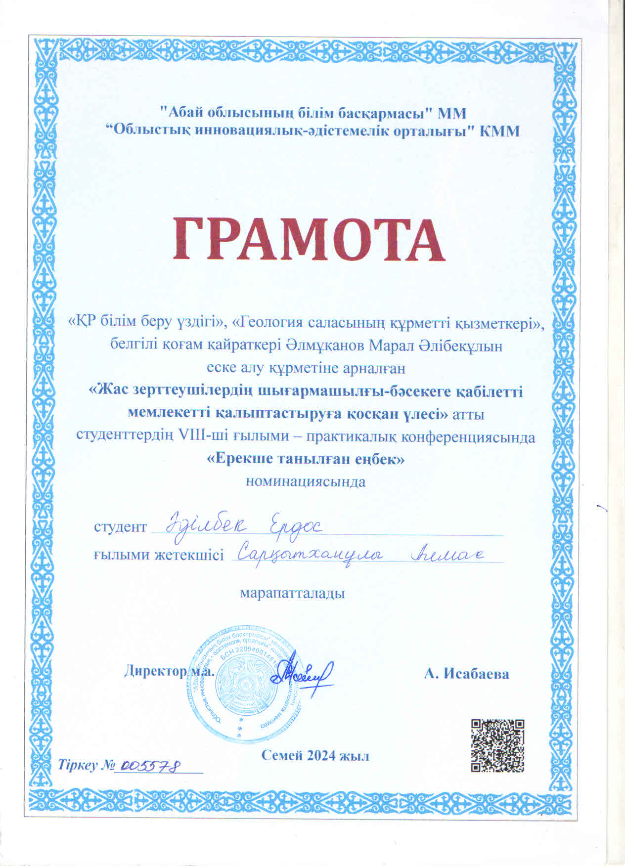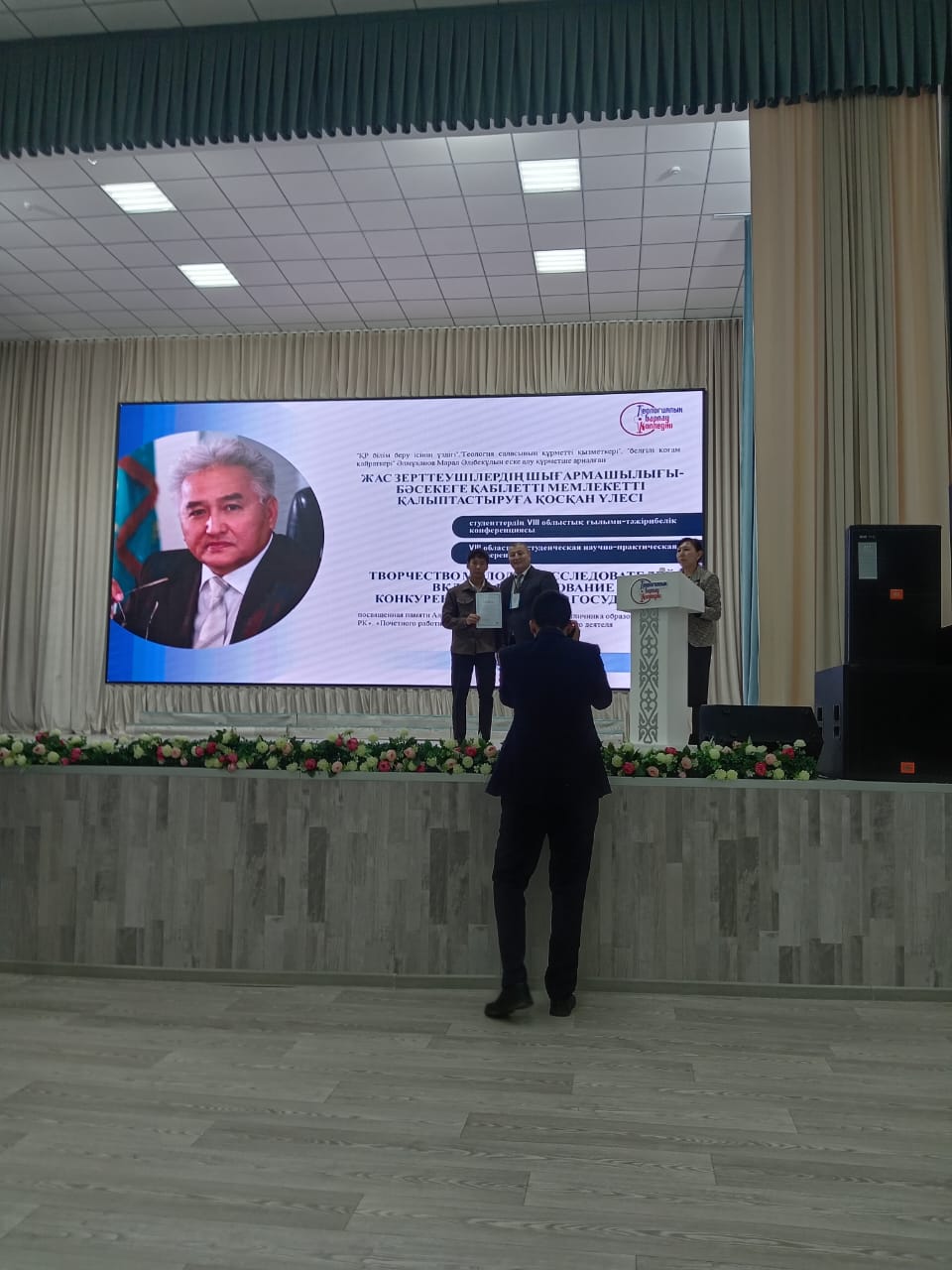 «ҚР білім беру үздігі» «Геологиял саласының құрметті қызметкері » белгілі қоғам қайраткері Әлмұқанов Марал Әлібекұлын еске алу құрметіне арналған «жас зертеушілердің шығармашылығы-бәсекеге қабілеті мемлекеттік қалыптастыруға қосқан үлесі» атты студенттердің VIII-ші ғылыми –практикалық конференциясында «Ерекше танылған еңбек» номинациясы бойынша Абай колледжі Ветеринария тобының студенті Әділбеков Ердос Қабидоллаұлы марапатталды . Ғылыми жетекшісі Сарқытханұлы Алмас.