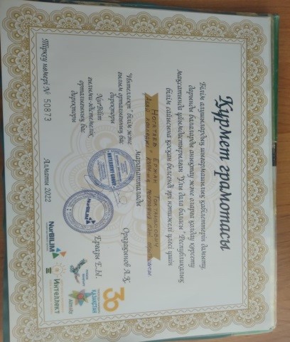 География пәні бойынша өткізілген сабақ барысында. «Абай колледжі»КММ-де оқитын 1-курс студенттері 2021-2022 оқу жылында алған білімдерін шындап,оқу кезінде тиісті бағаларын алып берілген үй тапсырмаларын уақытында орындап жоғары балдарын алып колледж ұстаздарының беделдерін көтеруде. «Интеллект» білім және ғылым орталығының ұйымдастыруымен колледж студенттері арасында өткен «Ұлы дала баласы» Республикалық пәндік олимпиадасының облыстық кезеңіне 16 – студент қатысып, «Интеллект» білім және ғылым орталығының директоры Оразақынов А.Қ. «NurBiLim» ғылыми-әдістемелік орталығының бас диреторы. Ерғазы Е.Ы. ағаларымыздан берілген тест тапсырмаларын орындап бірінші орындарға ие болып Дипломдармен марапатталды. География пәнінің мұғалімі Ногатаев Ержан Токтамысович «Білім алушылардың шығармашылық қабілеттерін дамыту,дарынды балаларды анықтау және оларға қолдау көрсету мақсатында ұйымдастырылған Ұлы дала баласы Республикалық білім сайысына қосқан белсенді әрі нәтижелі үлесі үшін». «Құрмет грамотасымен» марапатталдым.