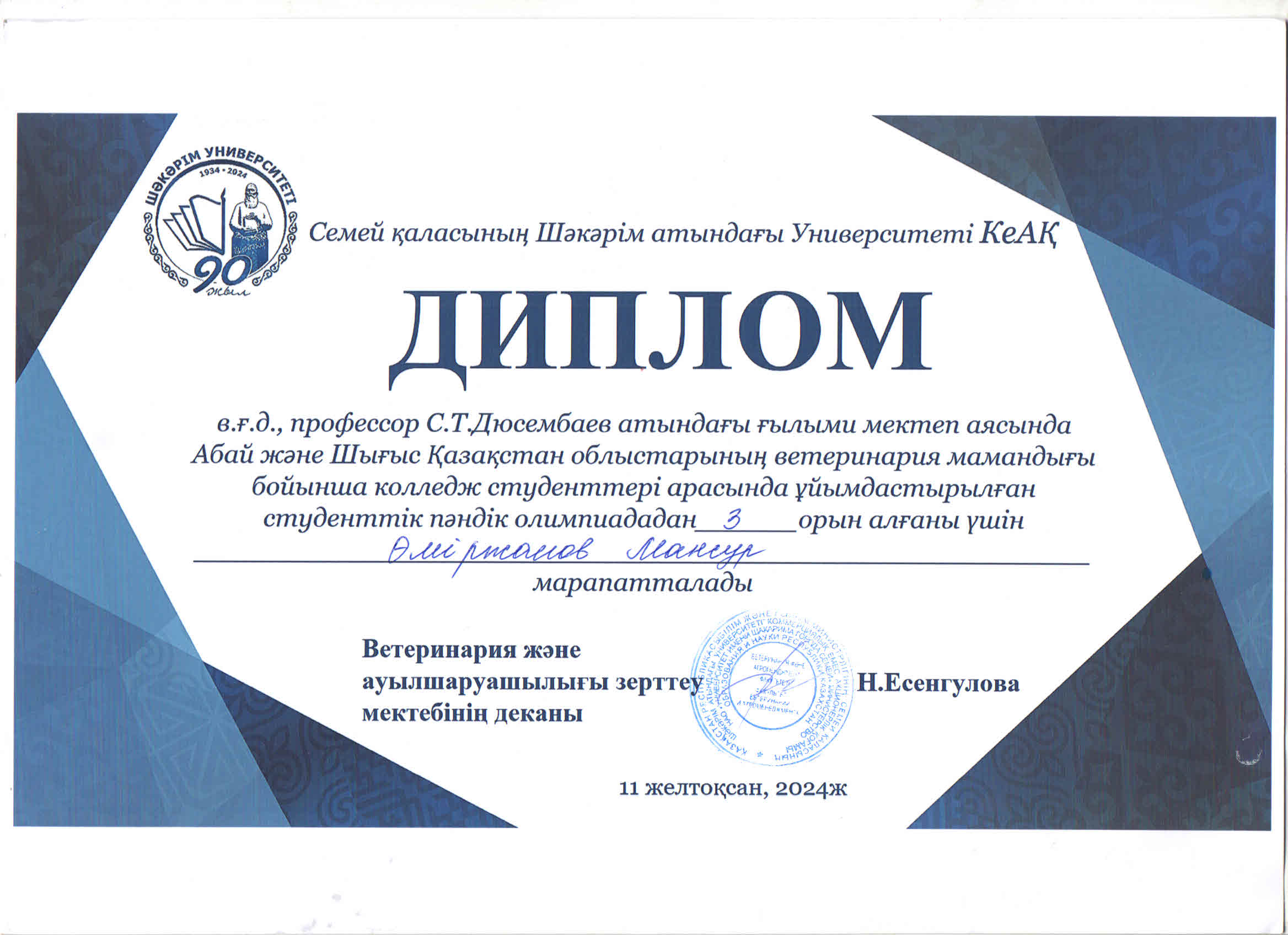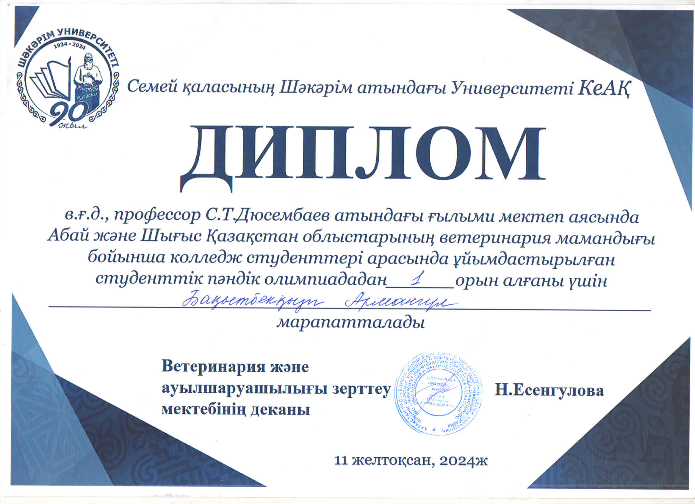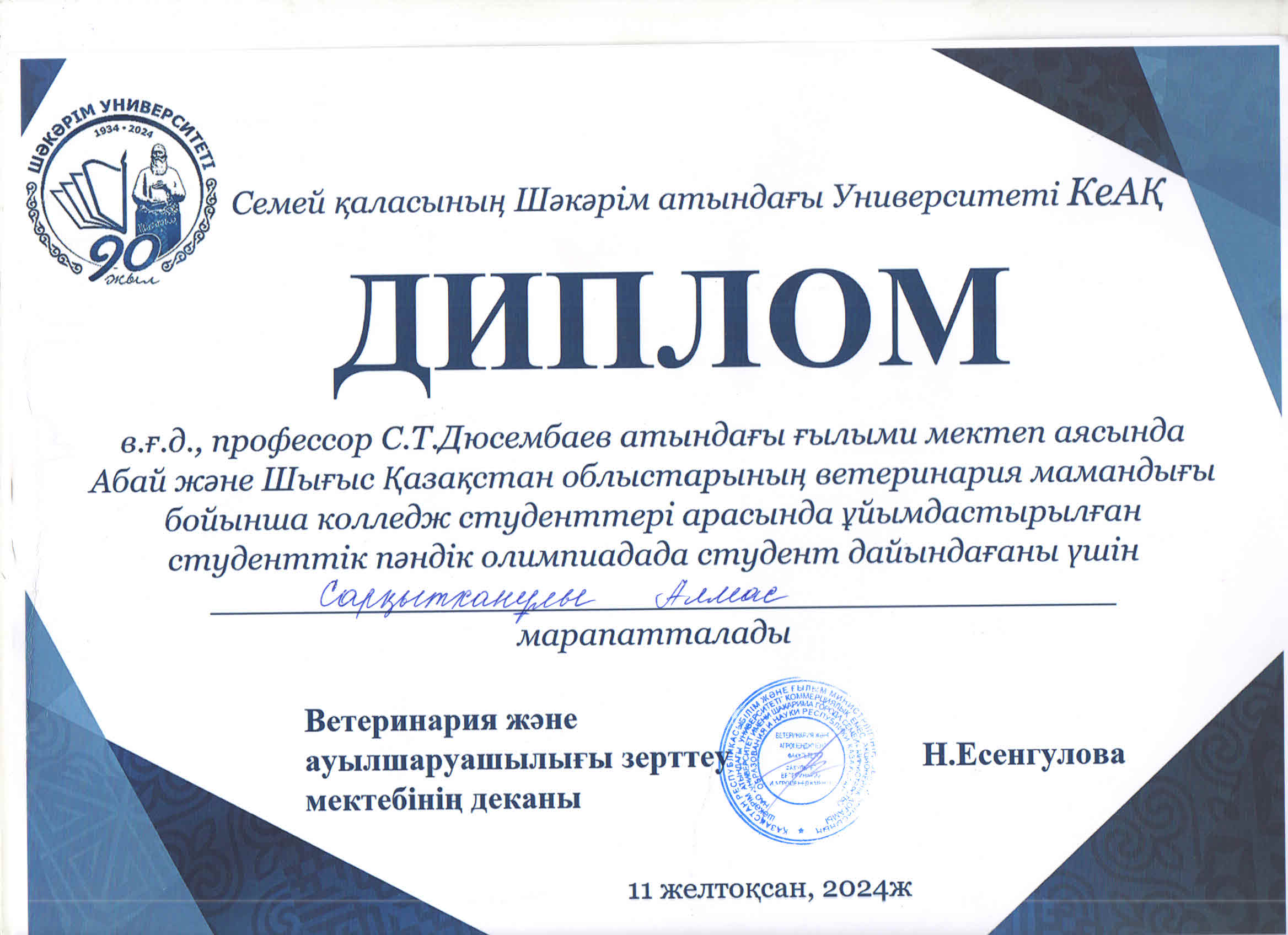 2024 жылғы 11 желтоқсанда Семей қаласының Шәкәрім атындағы университеті Абай және Шығыс Қазақстан облысының ветеринария мамандығы бойынша колледж студенттері арасында студенттік пәндік олимпиада өткізілді.
